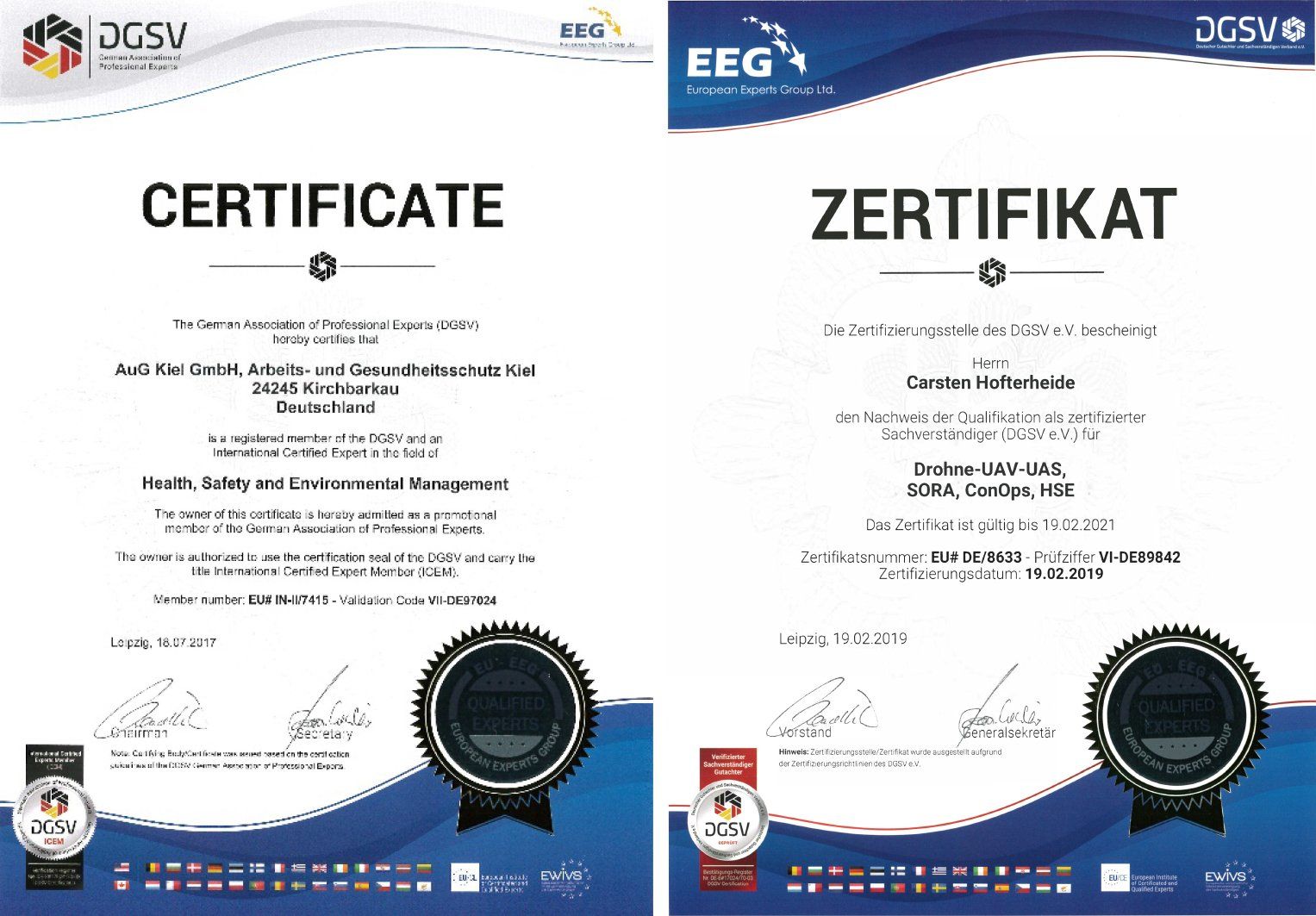 The company AuG Kiel GmbH is a registered company according to the international rules of the DGSV and the International Certified Expert Member (ICEM):
