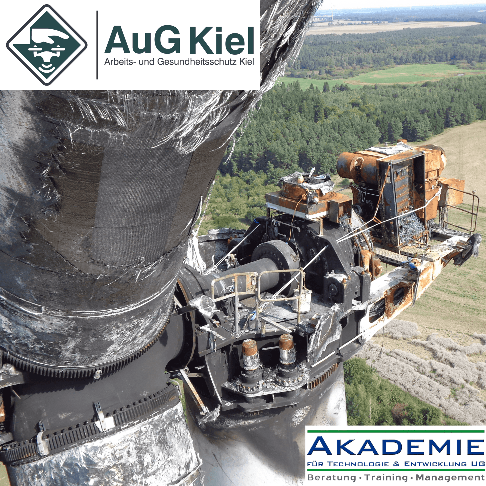 Especially in the initial assessment of a fire damage to a WEA caused by the necessary use of a crane often extremely high costs. Before preparing the risk assessment, AuG Kiel also uses aircraft drones for the initial assessment to record the damage in addition to video and photo cameras. Thus, the risks to be included in the dismantling and the handling of hazardous substances can be estimated and the avoidance of environmental damage taken into account.